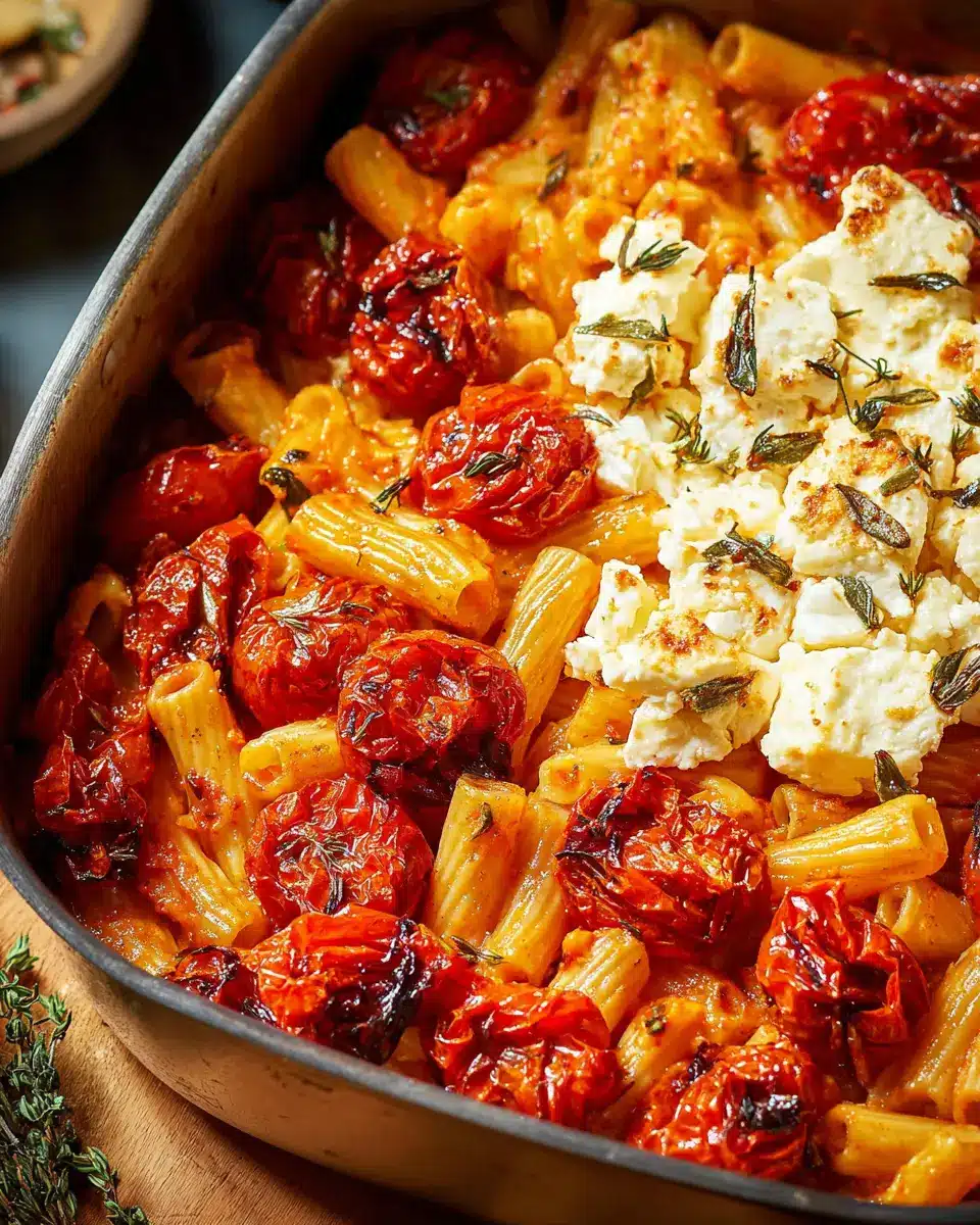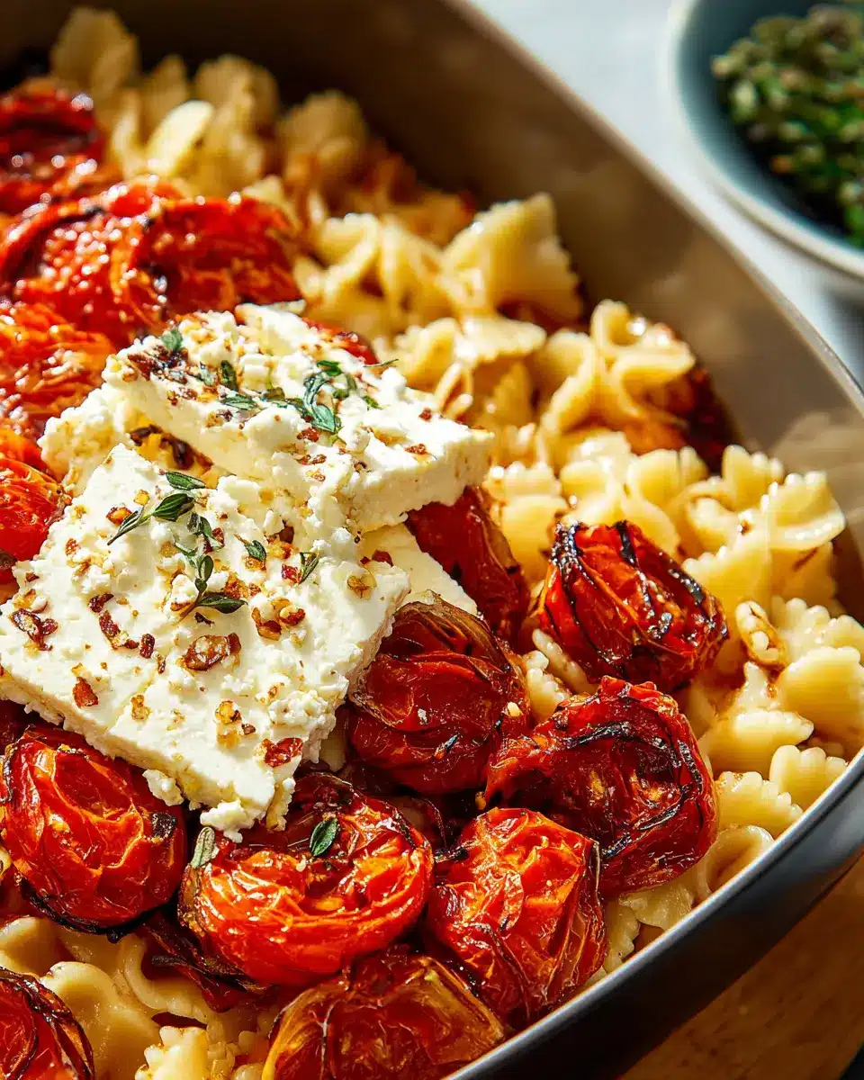 Top your baked feta pasta with fresh basil leaves for that inviting touch. This delicious and visually appealing dish is sure to impress, bringing a burst of flavor to your table. Enjoy every bite!