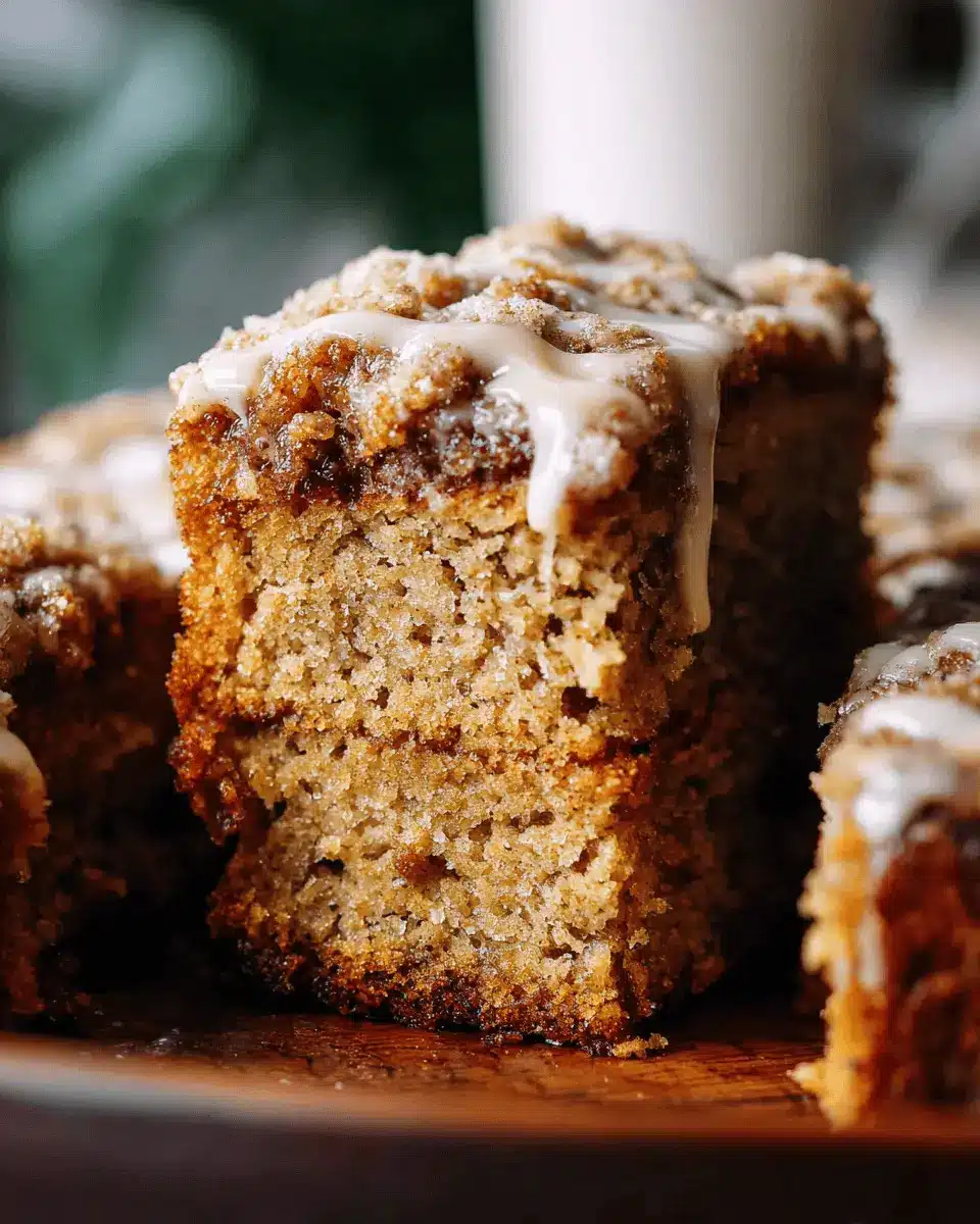 Once baked, cool your banana coffee cake for about 30-40 minutes. Meanwhile, whisk together ½ cup of powdered sugar and 1 tablespoon of milk for a simple icing. Adjust the consistency as needed. Drizzle it over the slightly warm cake, and you’re ready to slice into this delightful treat!