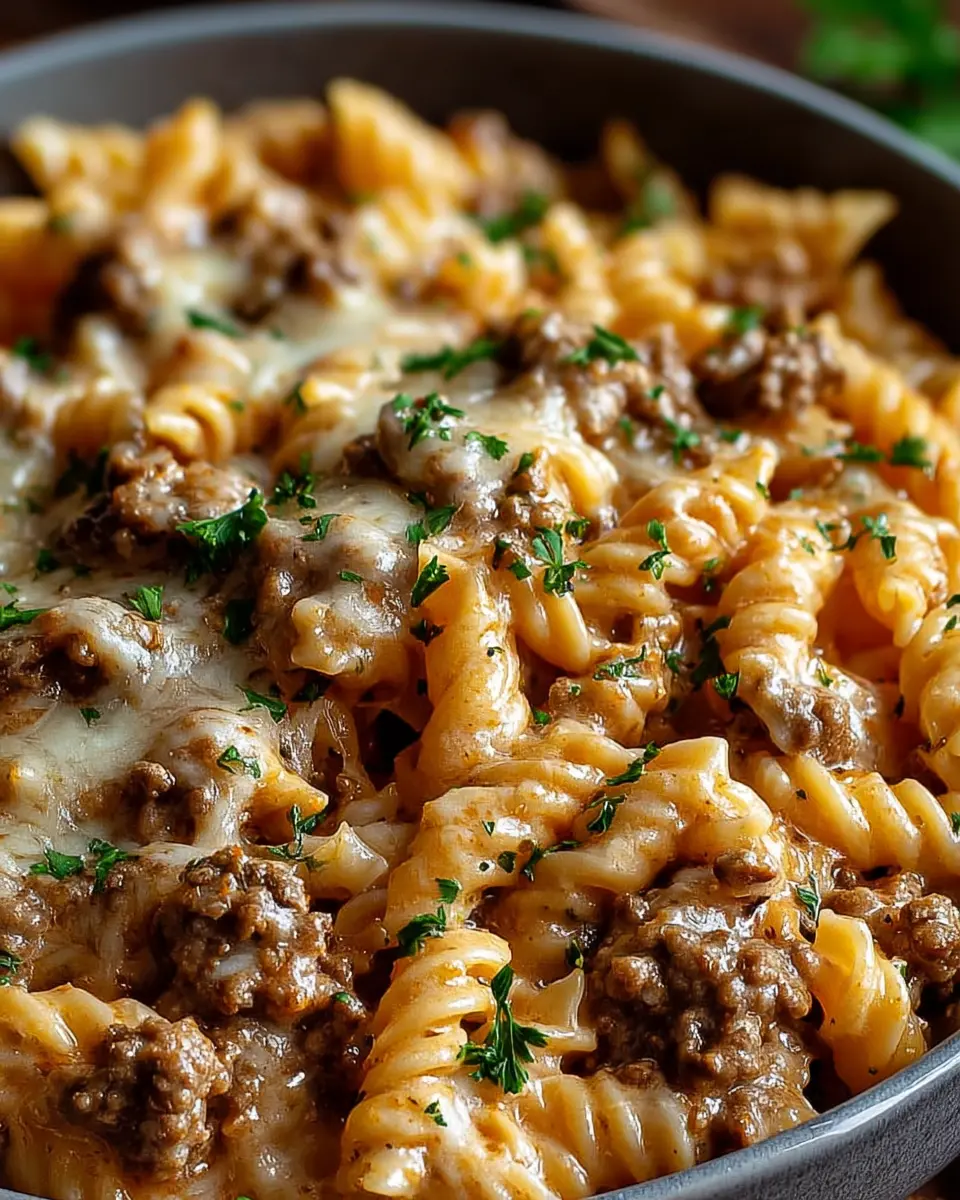 Finally, remove the skillet from heat and garnish your dish with freshly chopped parsley. This not only adds a pop of color but also brings freshness to your dish. Serve your creamy beef pasta hot and watch as it brings smiles to the table!
