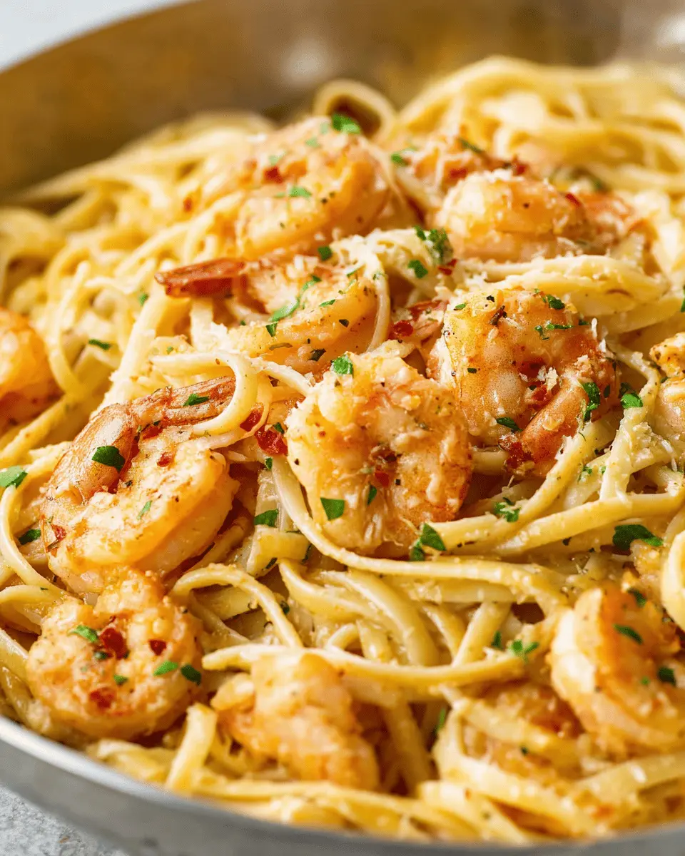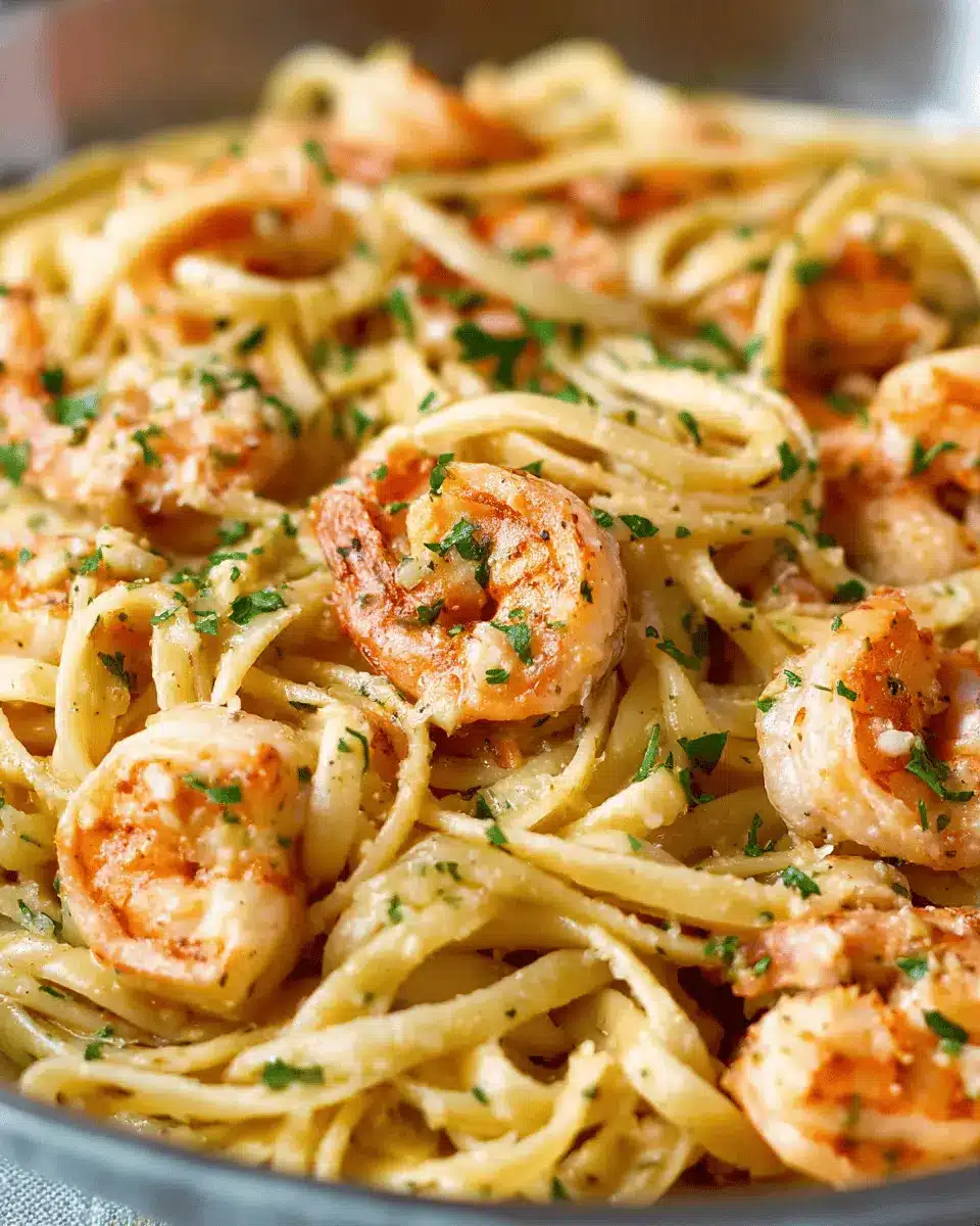 Now for the fun part! Toss the drained linguine into the skillet with the creamy garlic sauce. Mix well until the pasta is fully coated. Gently fold in the sautéed shrimp, allowing them to warm through. Finally, garnish with freshly chopped parsley for a pop of color and flavor.