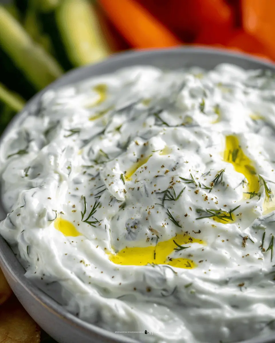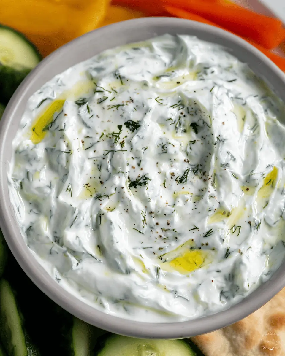 - Before serving, stir tzatziki sauce, transfer to a bowl, and drizzle with extra virgin olive oil. Serve with veggies or pita.