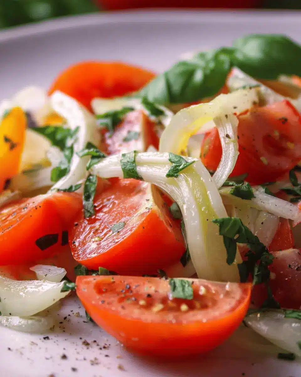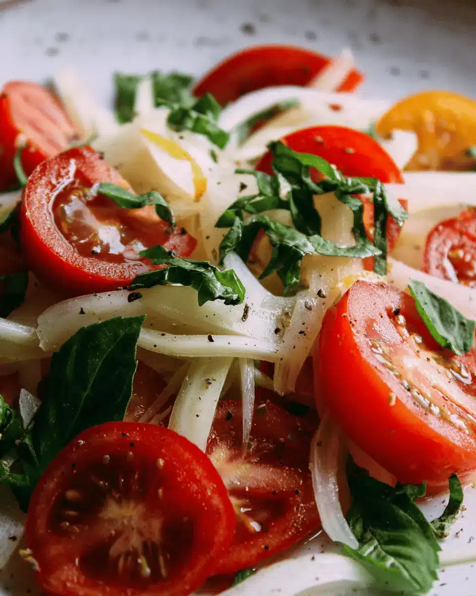 Feeling adventurous? Switch up the basil for other fresh herbs like mint, cilantro, or even dill to give your salad a unique flair. Each herb brings its own character, transforming your fennel, tomatoes salad, basil with lemon vinaigrette into a completely different experience. This little tweak can make the salad exciting and new, all while maintaining that refreshing essence. Why not try one herb this week and a different one next?