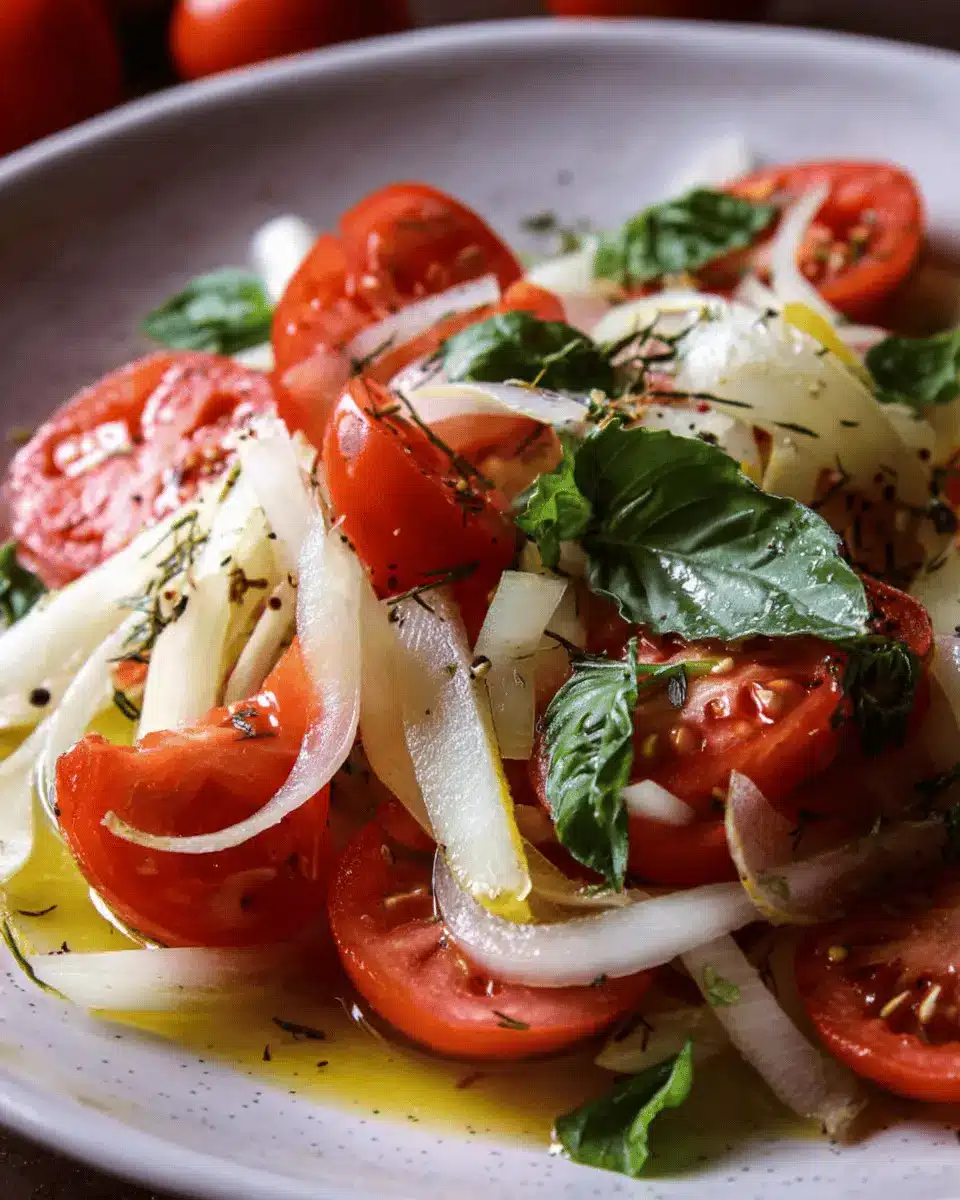 This fennel, tomatoes salad, basil with lemon vinaigrette is not just a dish; it’s a vibrant celebration of flavors that harmonize beautifully. Perfect for warm days or as a light starter, it’s simple yet sophisticated. Try it today, and let fresh ingredients elevate your dining experience!