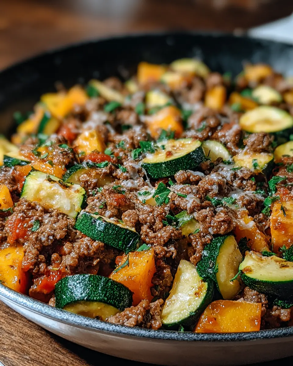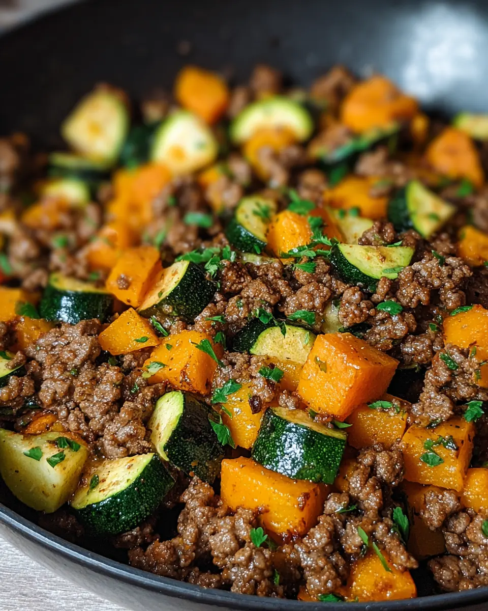 In summary, the Ground Beef Zucchini Sweet Potato Skillet is a delightful and nutritious dish that's perfect for busy weeknights. With its vibrant mix of protein and vegetables, this one-pan wonder not only saves time but also packs a flavorful punch. Enjoy a satisfying meal that delivers both taste and health benefits!