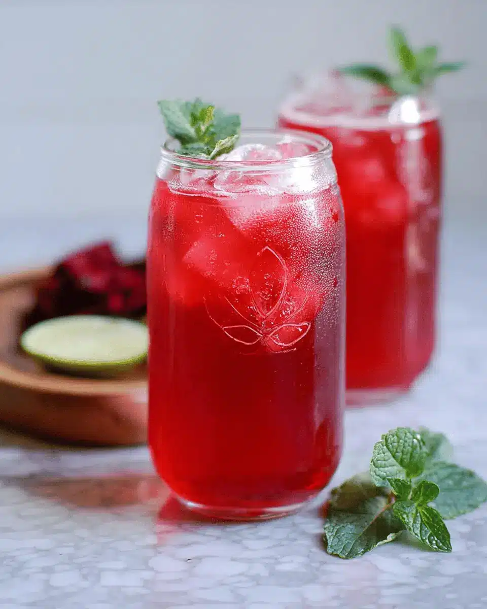 Now it’s time to enjoy your creation! Grab some glasses and fill them with ice, then pour the chilled hibiscus tea over. For an extra touch of elegance, garnish your drink with fresh mint leaves and lime wedges. Not only does it enhance the aesthetics, but the herbs and citrus will give your iced tea a refreshing aroma that’s hard to resist.