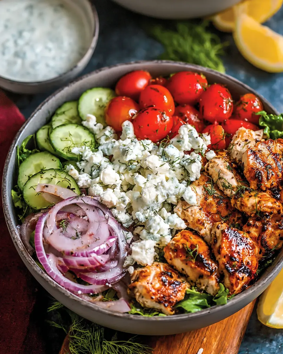 - Divide the chicken among four individual serving bowls. Top with the cucumber, tomatoes, onion, olives, and feta cheese. Pour the dressing over the bowls and top each with tzatziki just before serving.