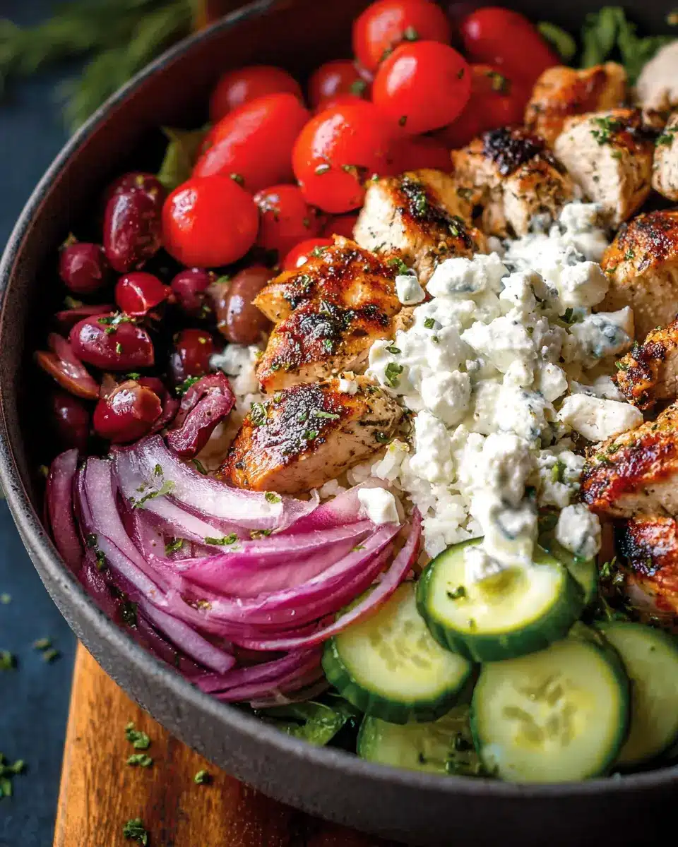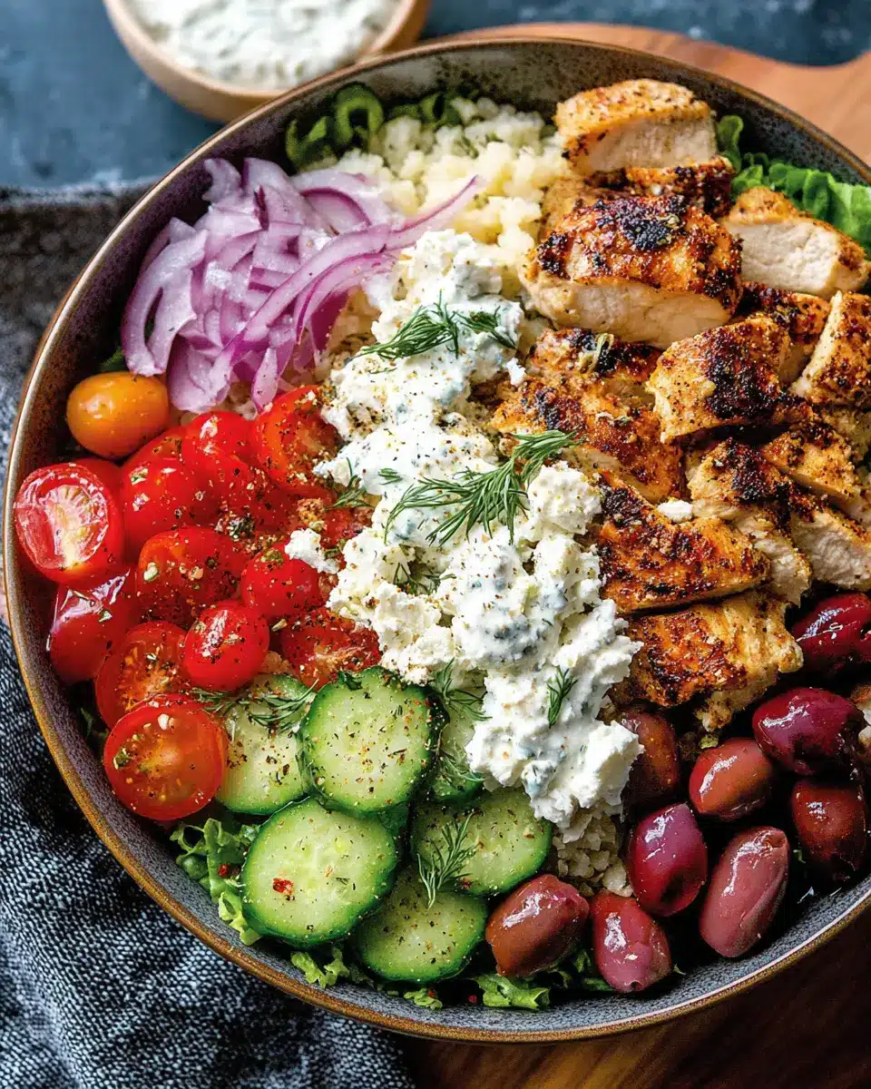 Finally, don’t skimp on toppings! Diced Persian cucumber, halved cherry tomatoes, thinly sliced red onion, Kalamata olives, and crumbled feta cheese not only bring vibrant colors but also a variety of textures. These ingredients make your Low-Carb Greek Chicken Bowls both nutritious and visually appealing.