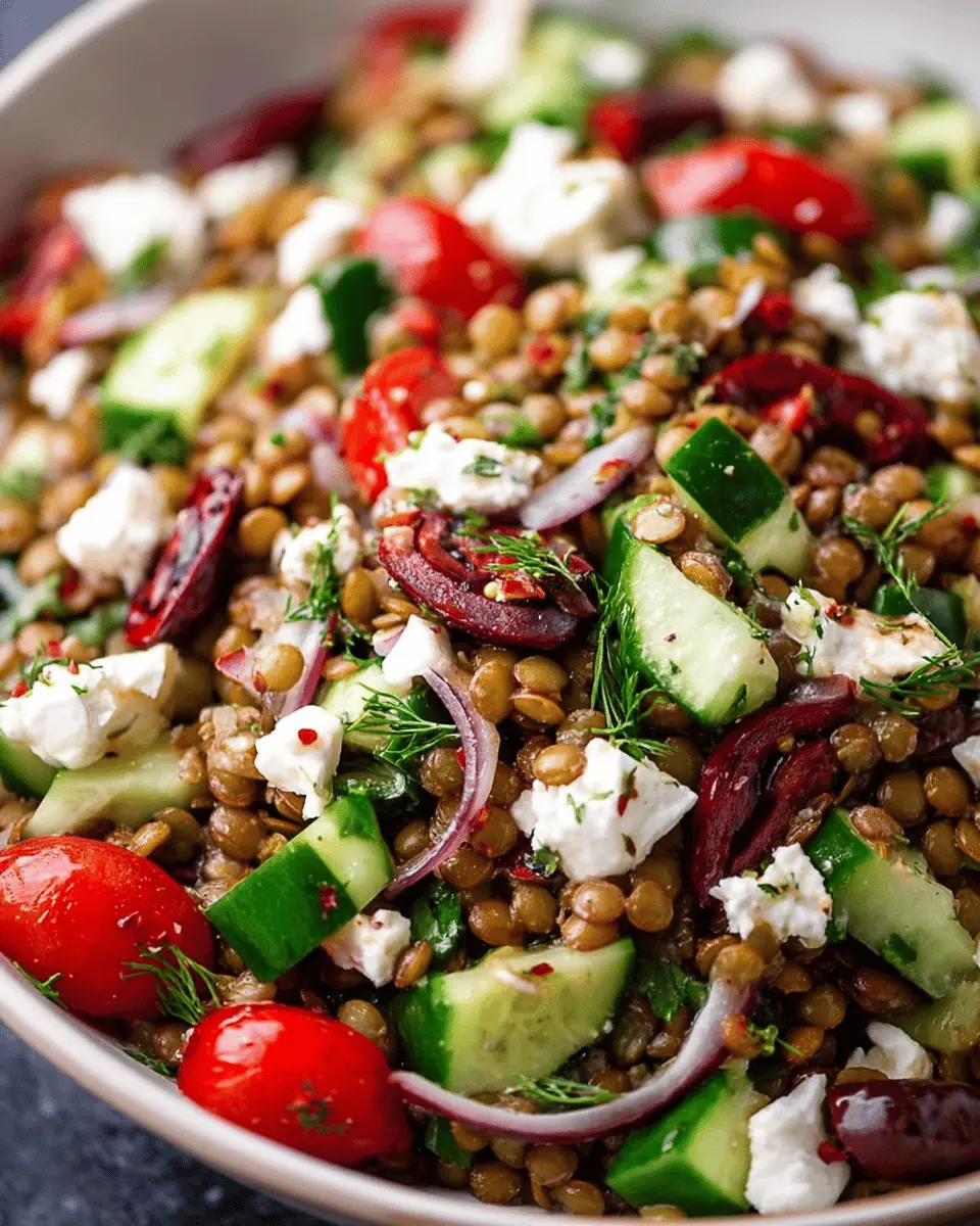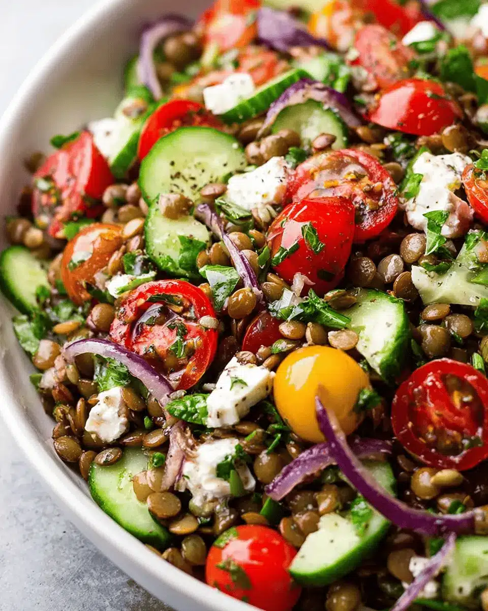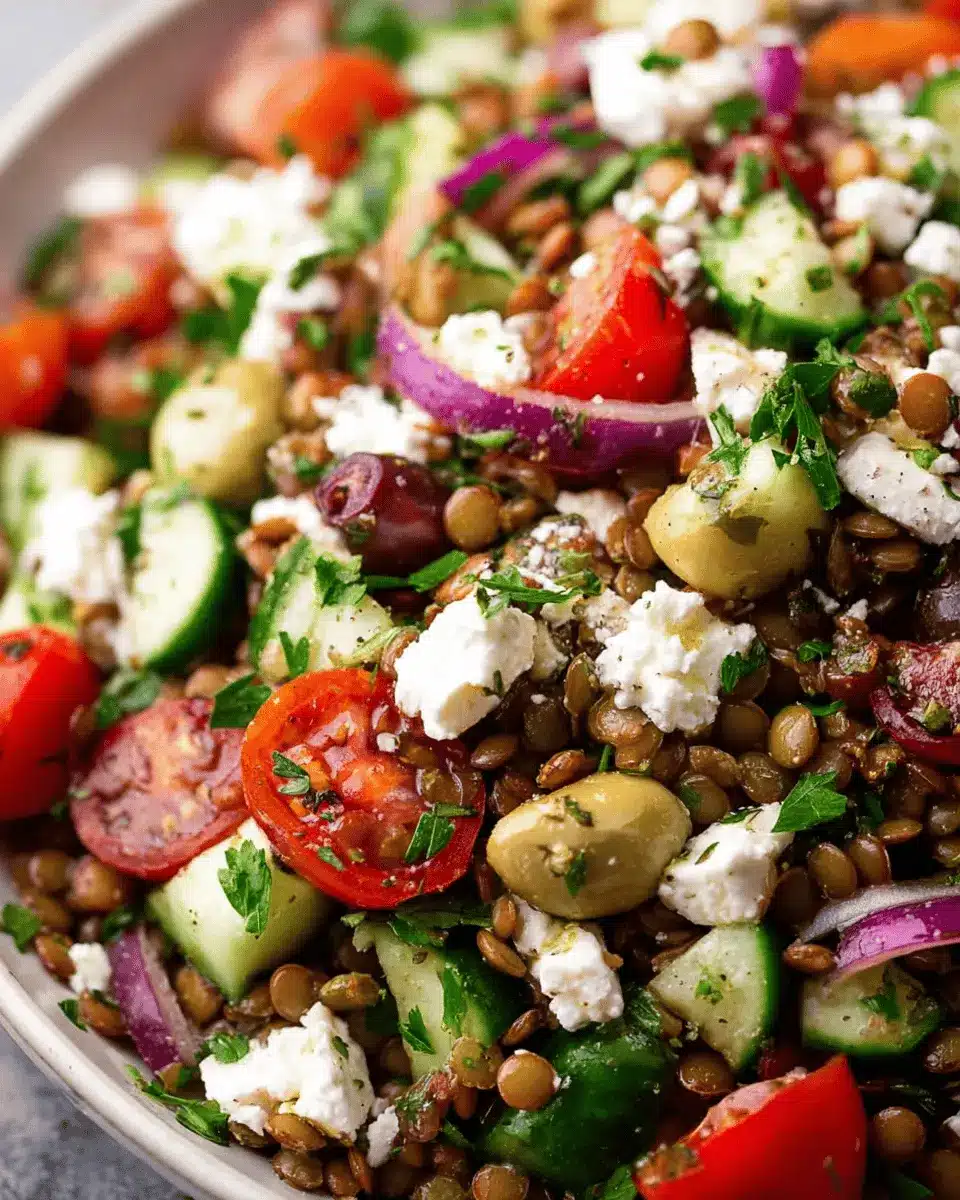 The Mediterranean Lentil Salad makes for an incredibly satisfying standalone lunch. Packed with protein-rich lentils, fresh vegetables, and zesty vinaigrette, it keeps you fueled through the afternoon. Pair it with some whole-grain pita for extra fiber or enjoy it with a slice of crusty bread. This salad is not just nutritious; it’s a delightful burst of flavors and textures!