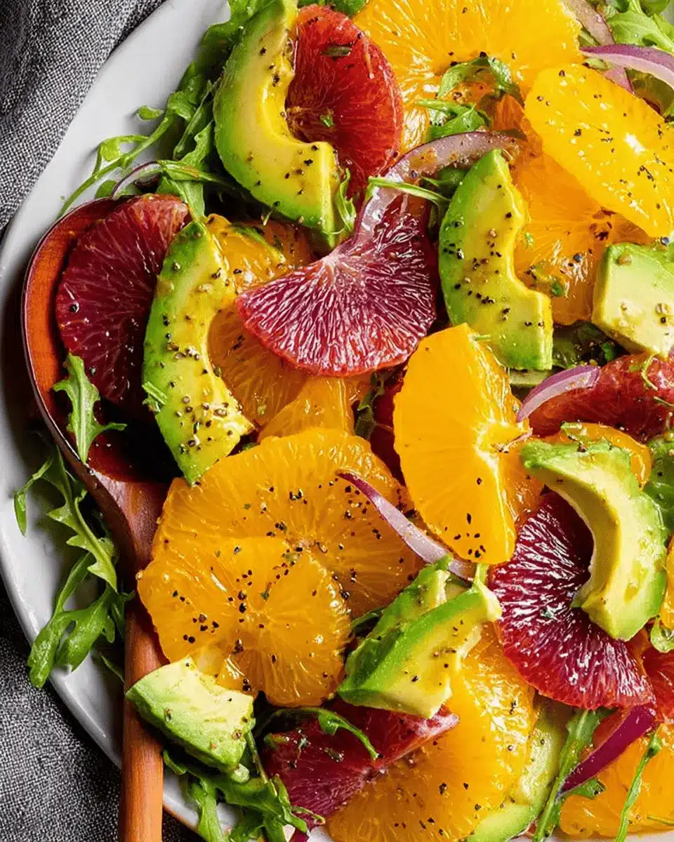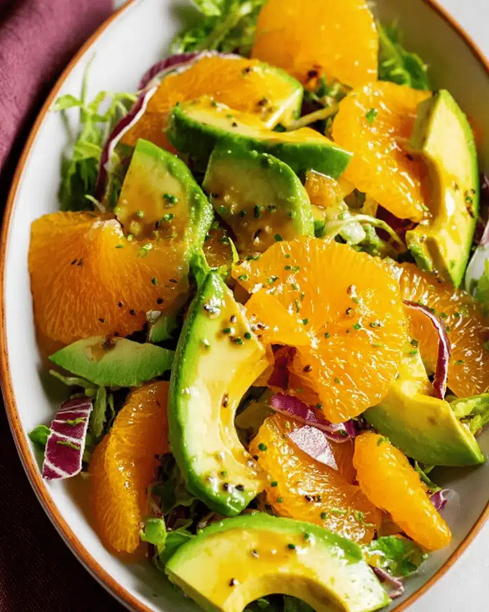 Finally, it’s time to assemble your masterpiece! Arrange the sliced oranges and avocados atop the bed of greens, interspersing the red onion for a splash of color. A light sprinkle of kosher salt and fresh cracked pepper will enhance the flavors without overpowering them.