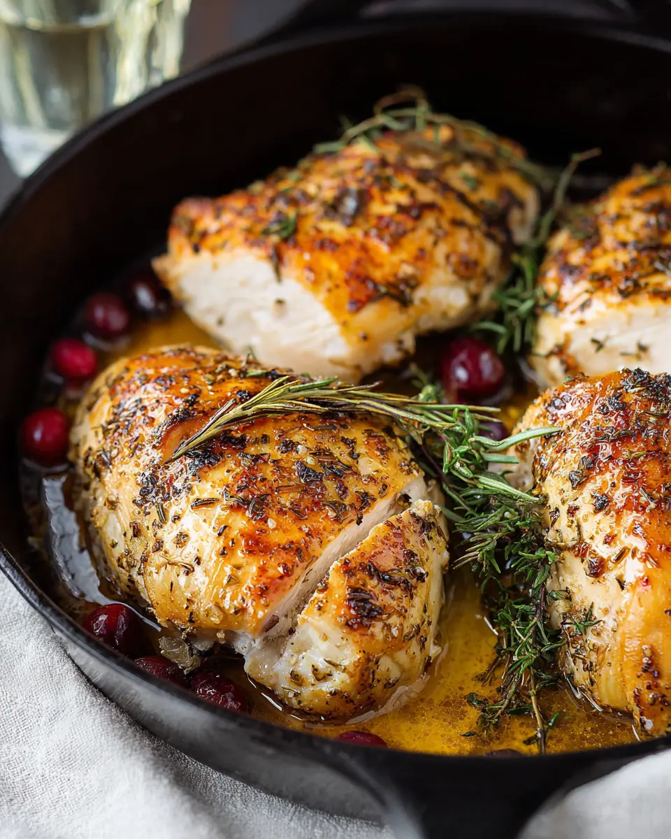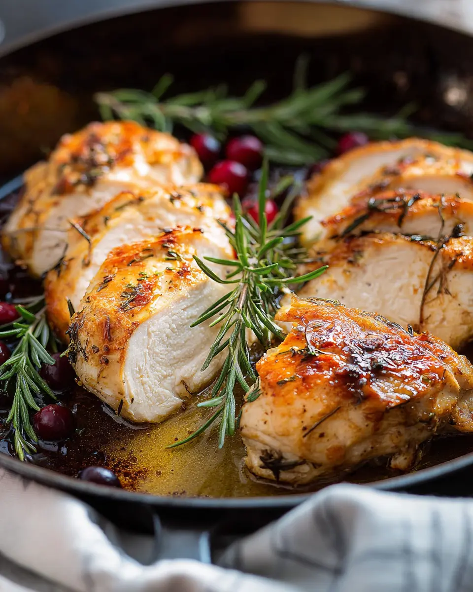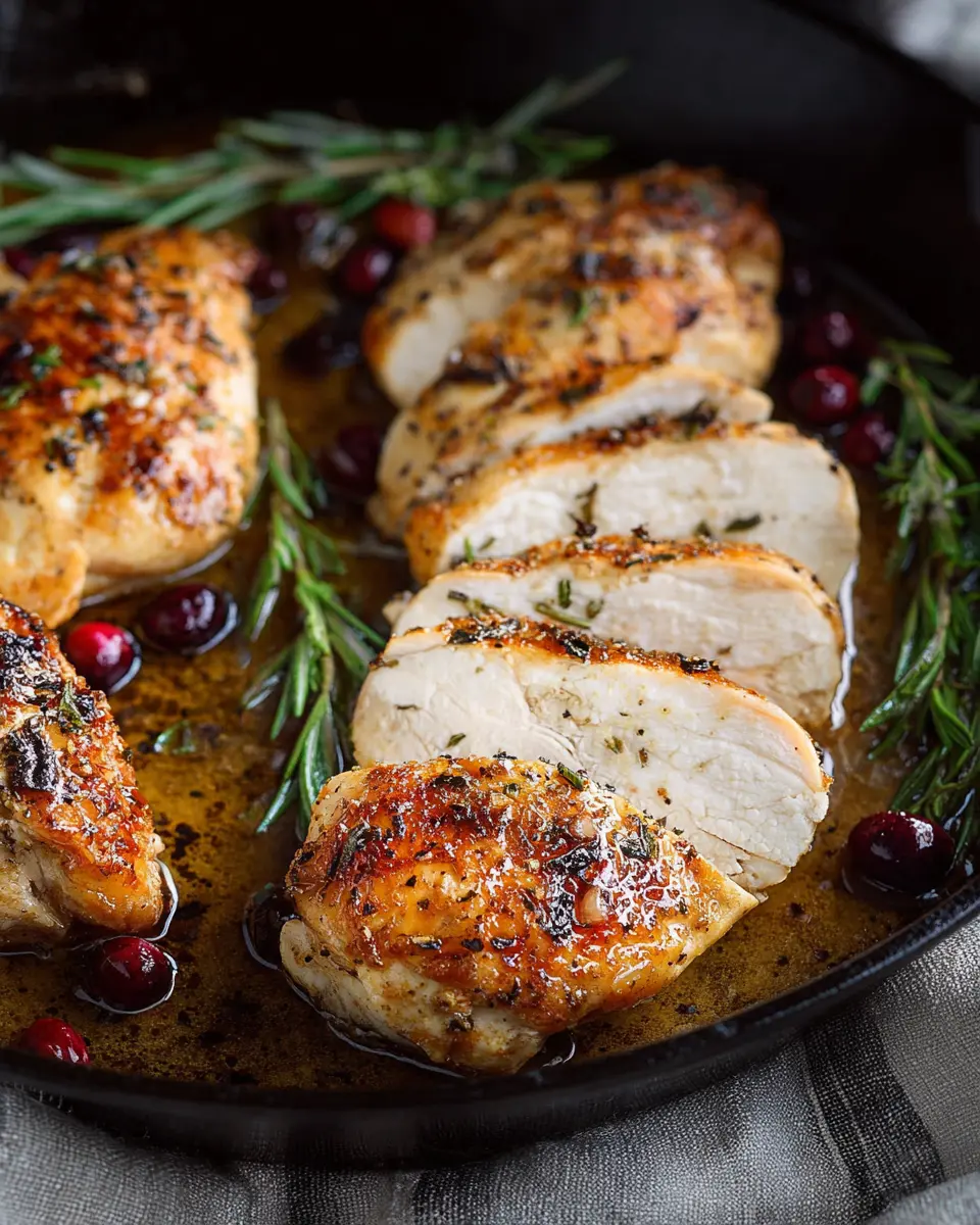 After searing, create a flavorful baking mix in the skillet. Combine the chicken broth, honey, minced garlic, cranberries, and rosemary in the skillet with the chicken. This mixture will infuse the chicken with moisture and flavor while it bakes. Pop the skillet into the oven, preheated to 360°F, for about 25-30 minutes. The chicken will soak in those fantastic flavors.