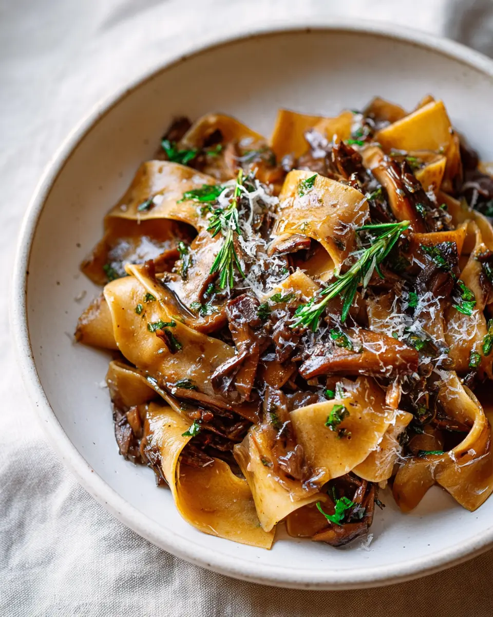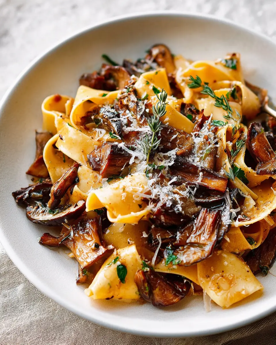 At this point, your kitchen should smell absolutely divine! Finish off your dish by shaving curls of Parmigiano cheese over the pasta with a vegetable peeler. Plate it up into warm bowls and serve immediately for a comfort dish that feels gourmet. Give yourself a moment to savor the flavors of your portobello mushroom pappardelle. Pair it with a crisp salad or some fresh bread, and you’re all set!