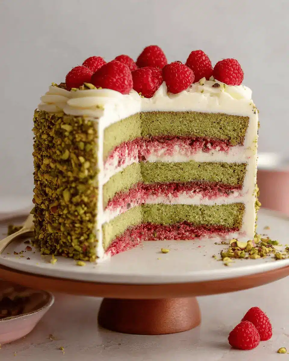 - Final Frosting: Finish off with mascarpone buttercream and give it a decorative touch using a cake comb. Press the reserved pistachio crumbs around the base, and top with fresh raspberries.