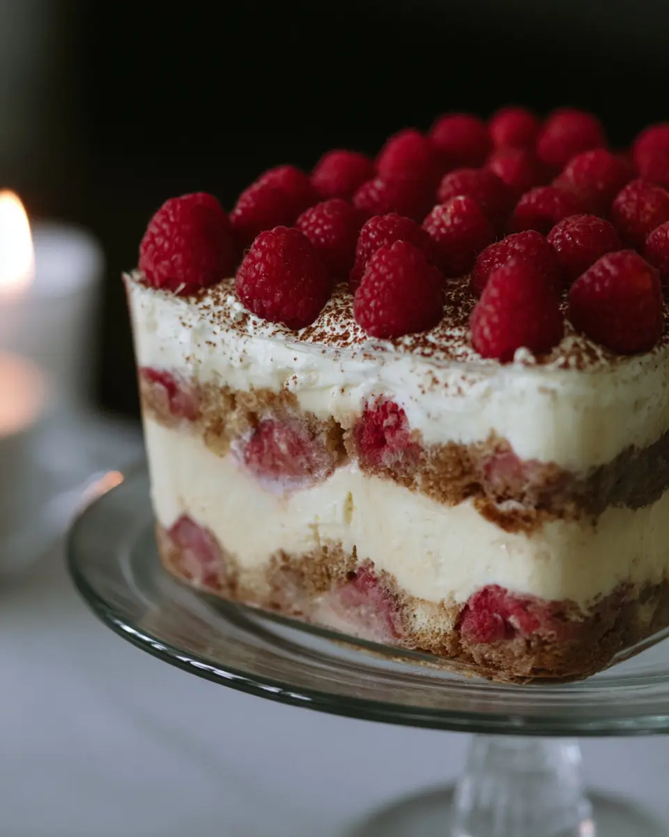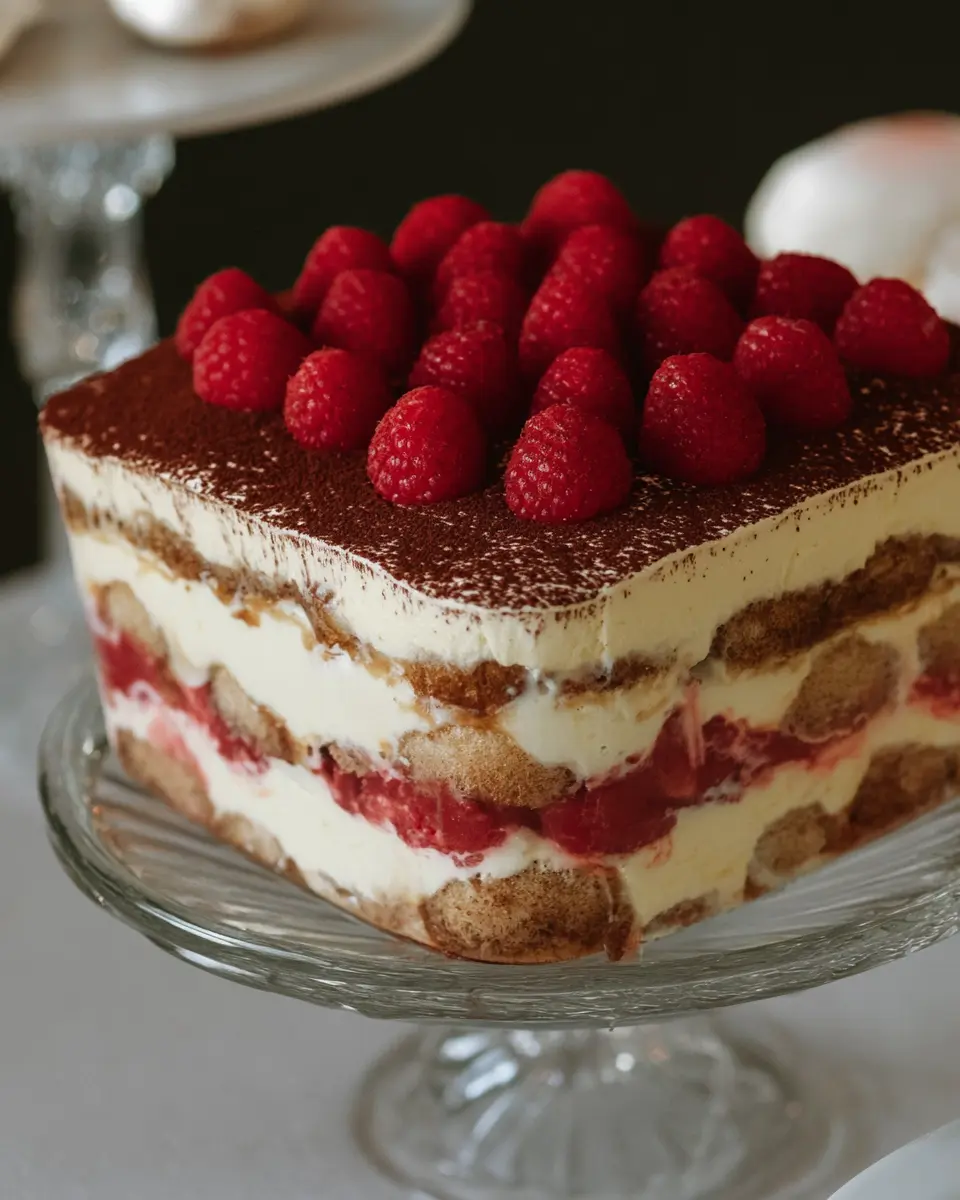 Cover your trifle dish with plastic wrap and refrigerate it for at least 4 hours, or even overnight for the best results. When you're ready to serve, top with fresh raspberries for that gorgeous finish. Enjoy your fancy raspberry tiramisu!