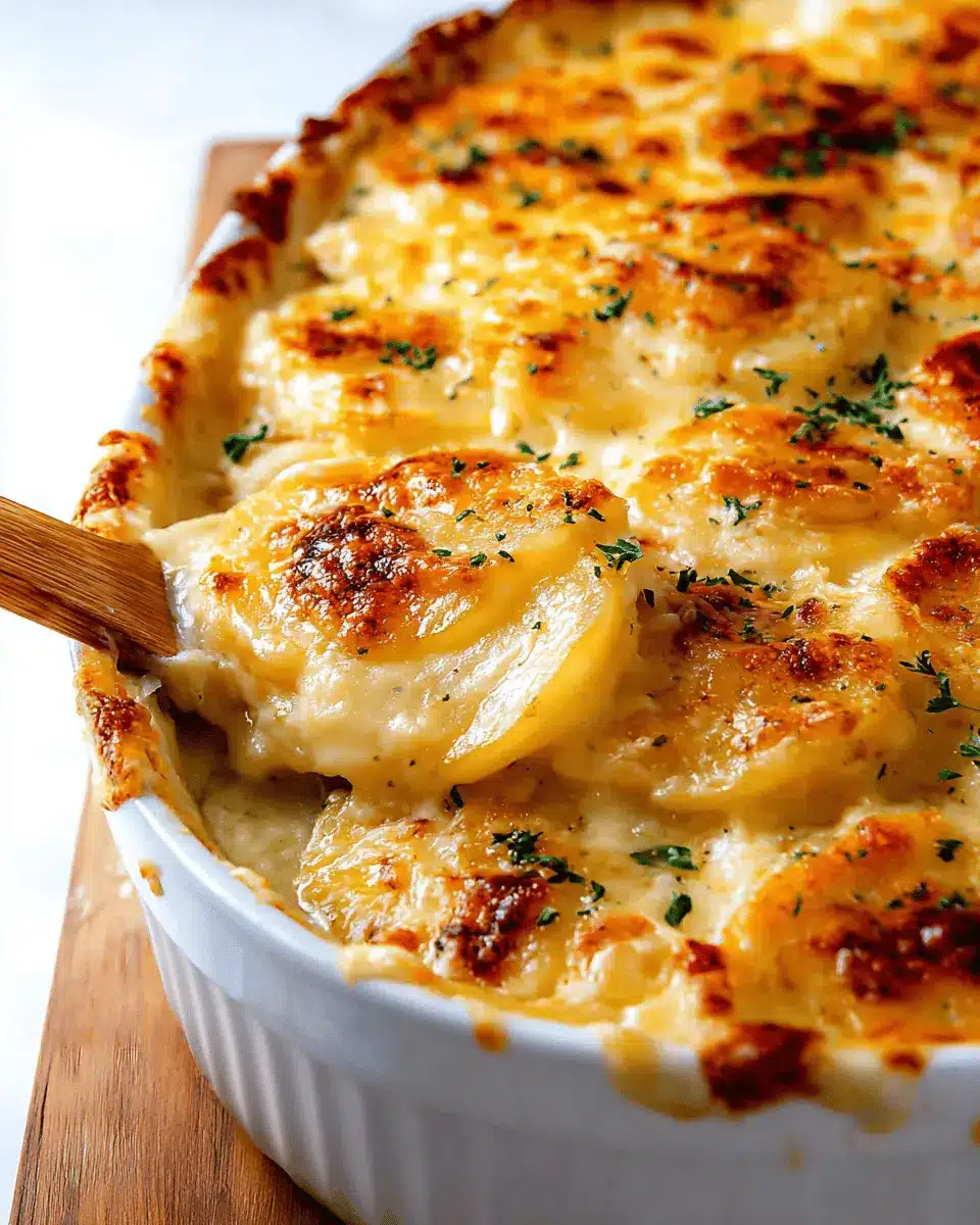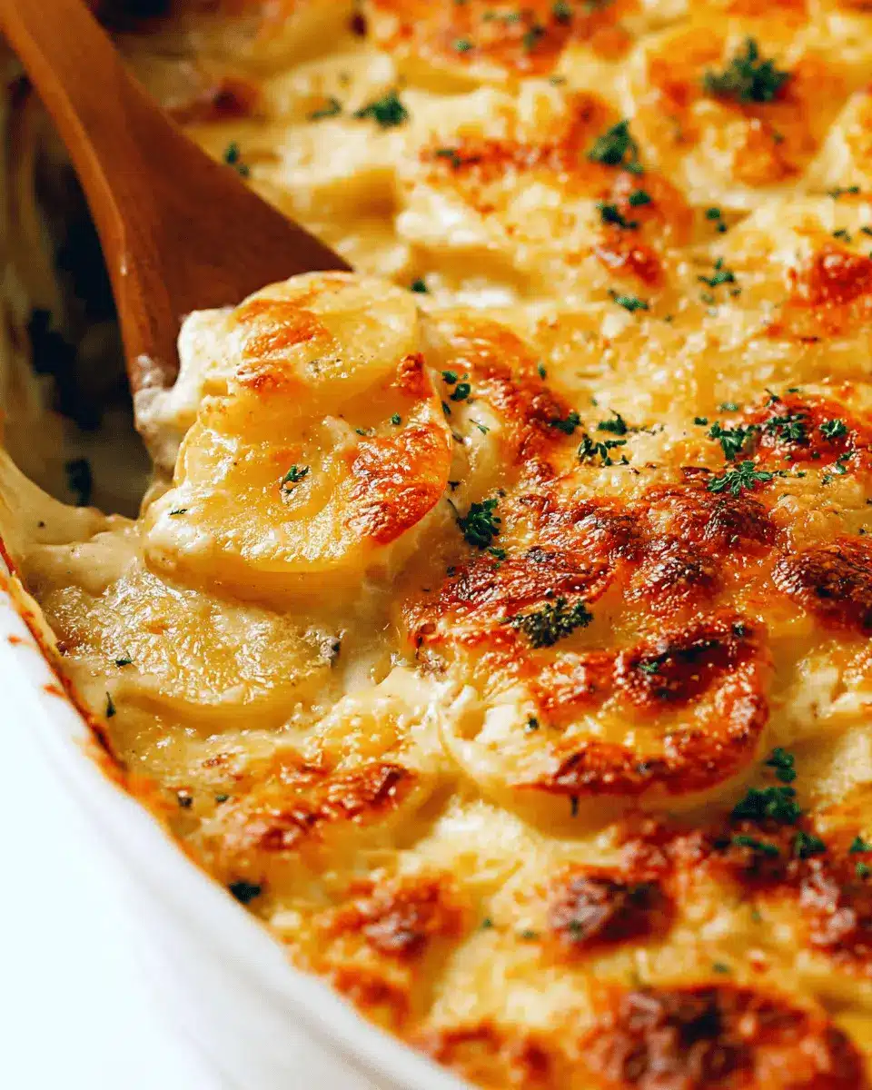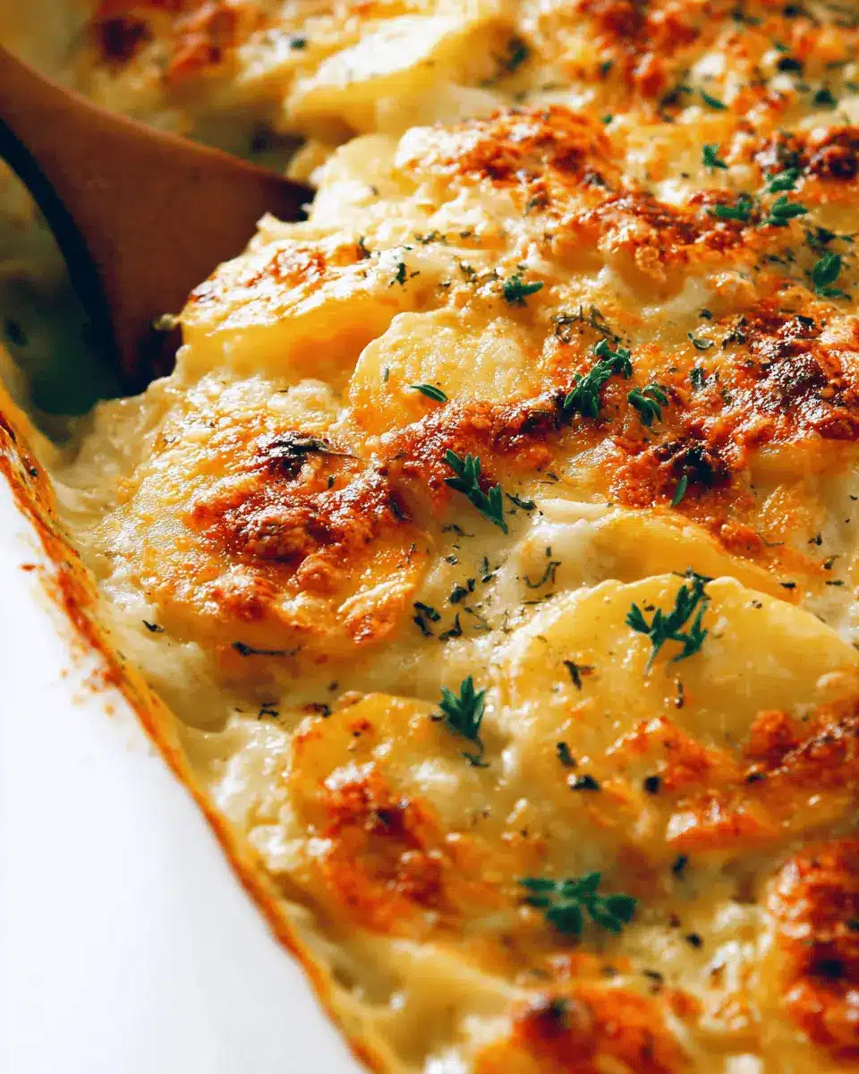 Once done, let your scalloped potatoes cool for a few moments, then garnish with a sprinkle of fresh thyme and some extra Parmesan. Serve warm and enjoy the delightful blend of cheesy goodness and creamy potatoes that everyone will love!