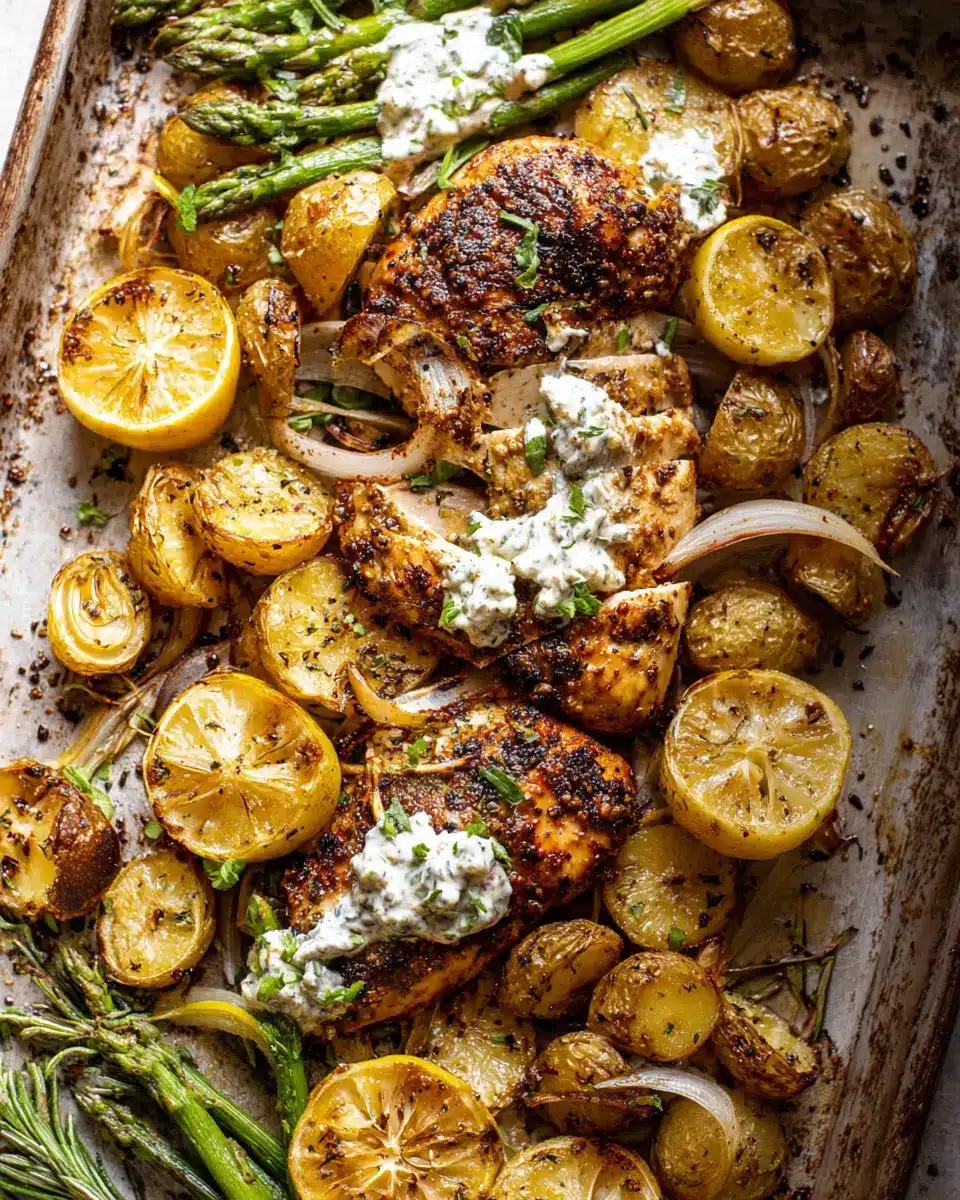 Sheet Pan Lemon Rosemary Dijon Chicken and Potatoes with Feta Goddess Sauce