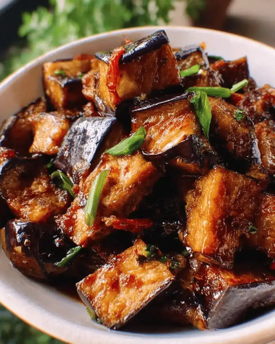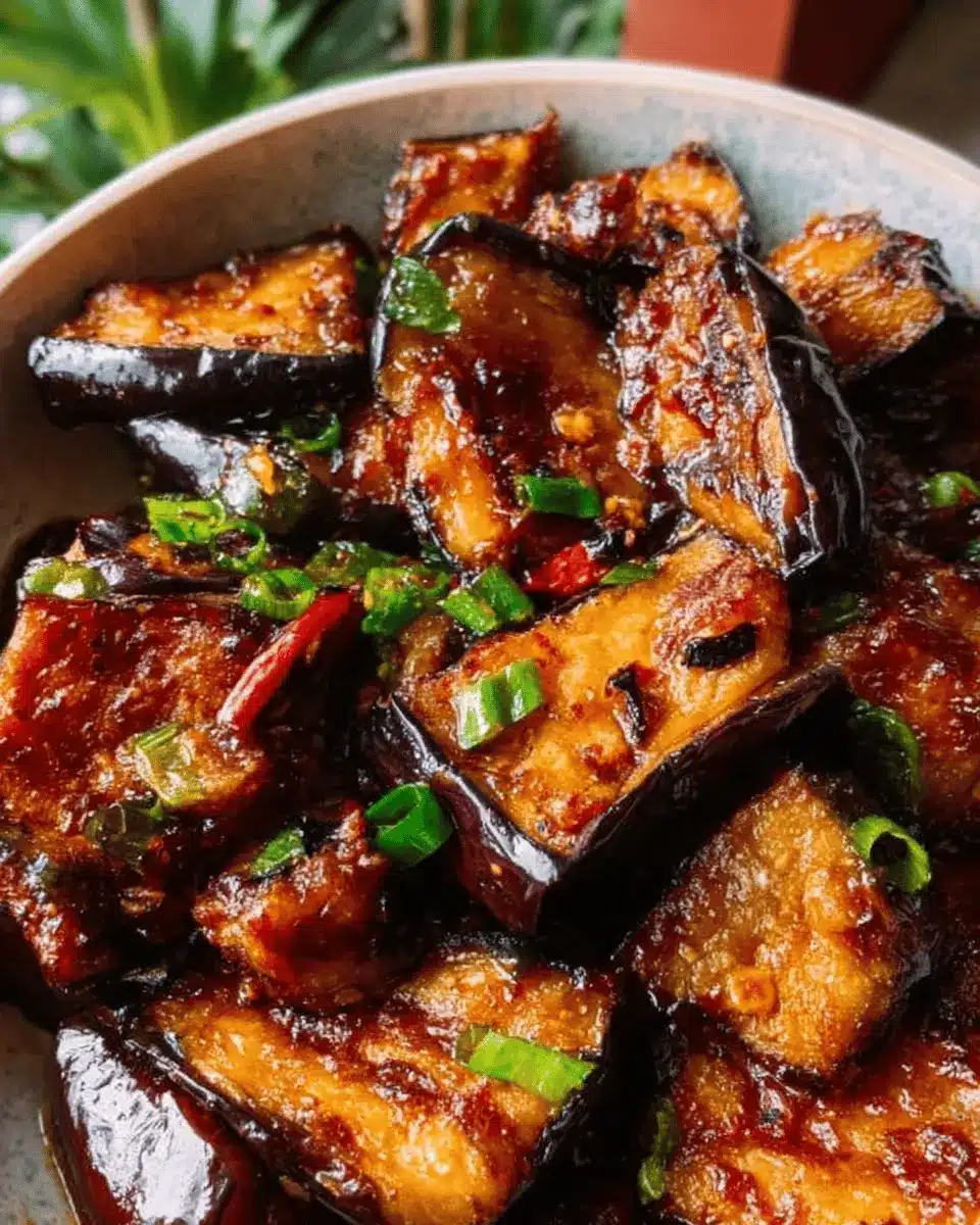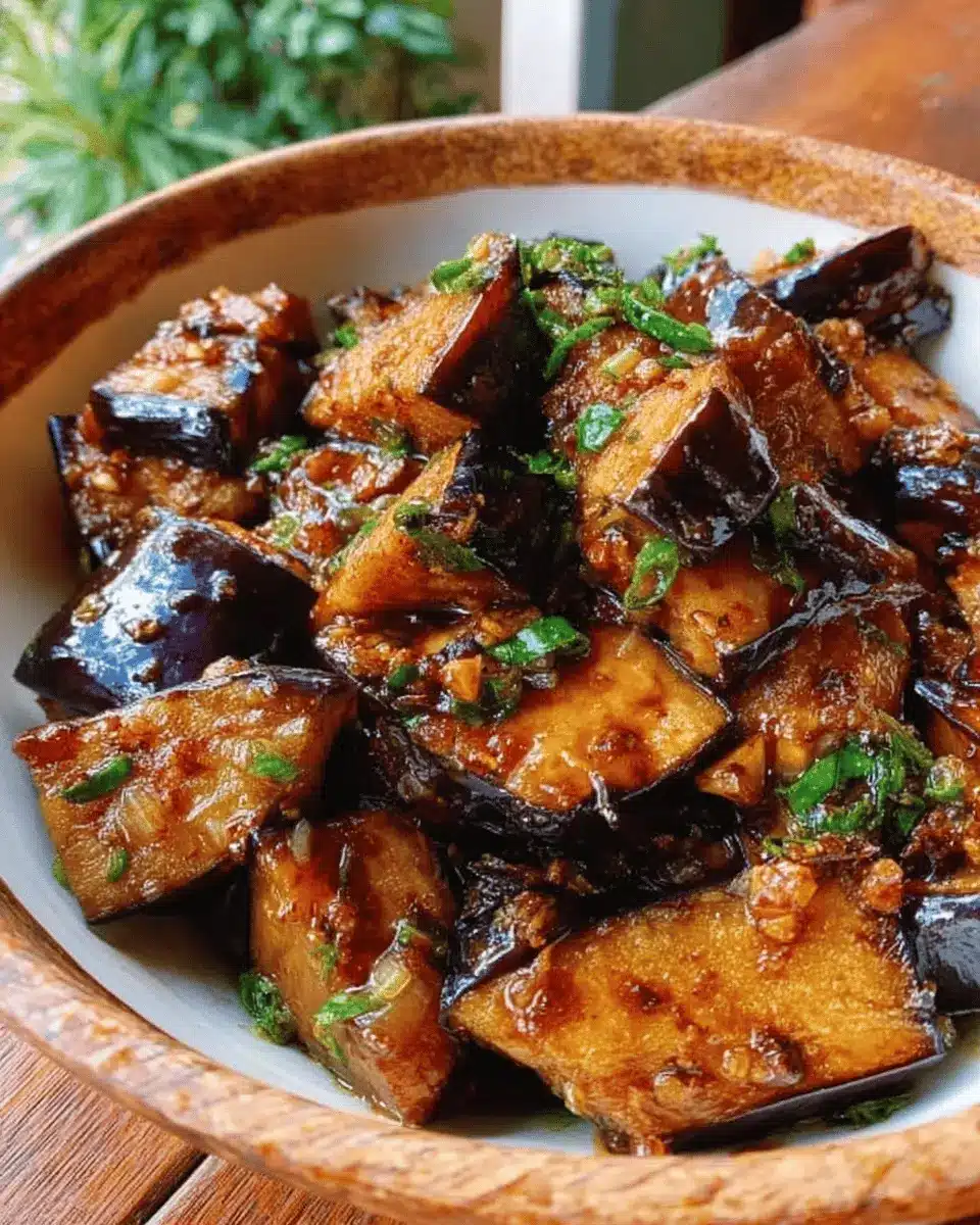 Before serving, give your Sticky Garlic Eggplant a final touch. Garnish with freshly sliced spring onions and a sprinkle of toasted sesame seeds for that extra pop of flavor! Serve this dish warm alongside steamed rice or noodles for a delightful meal that’s sure to impress. Enjoy every sticky, garlicky bite!