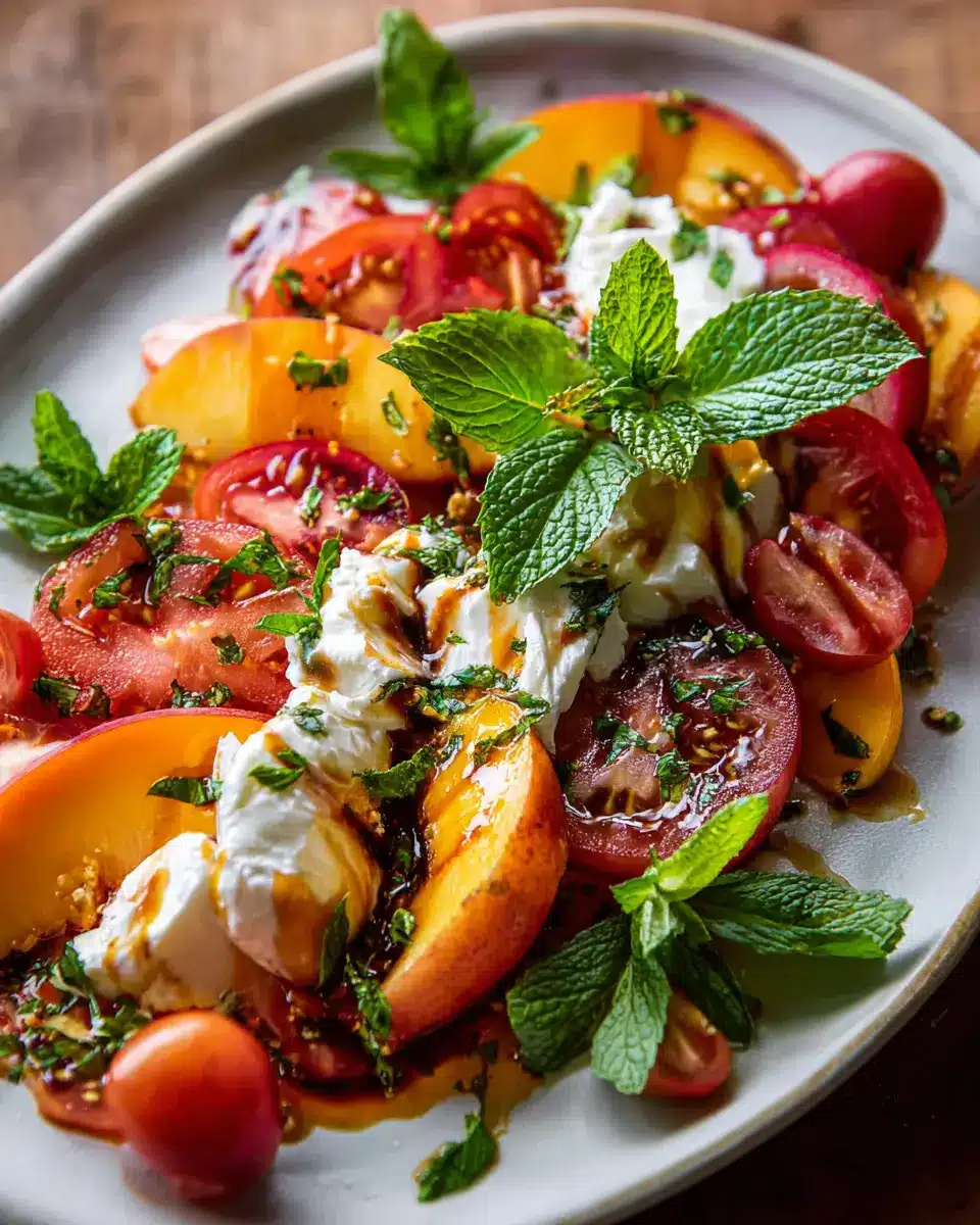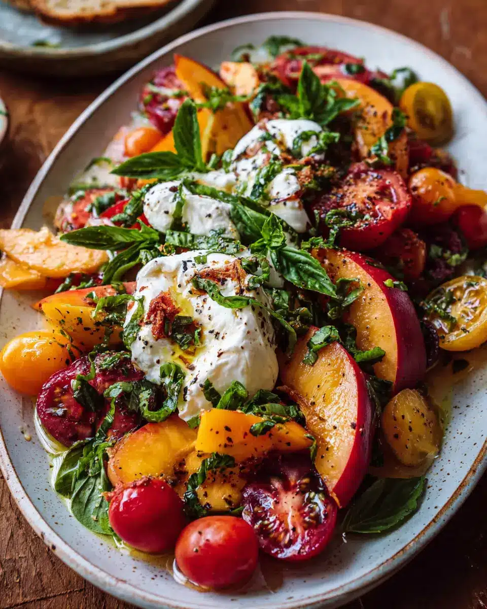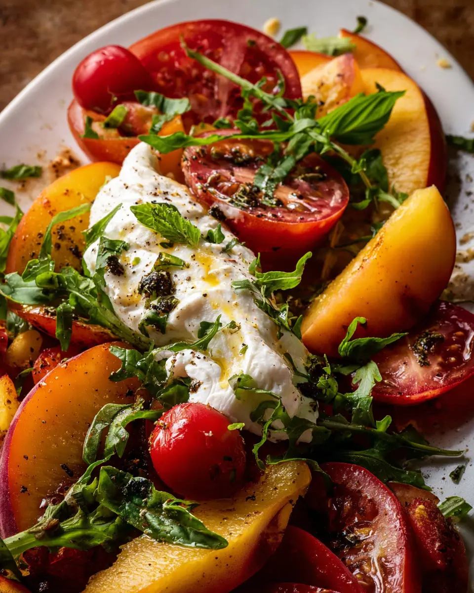 This salad takes just a few minutes to put together, making it the perfect solution for those rushed weeknight dinners or weekend gatherings. With fresh ingredients like juicy cherry tomatoes, ripe peaches, and creamy burrata, it’s not only a feast for the eyes but also bursting with flavor. The best part? It requires no complicated cooking methods—just combine, toss, and enjoy!