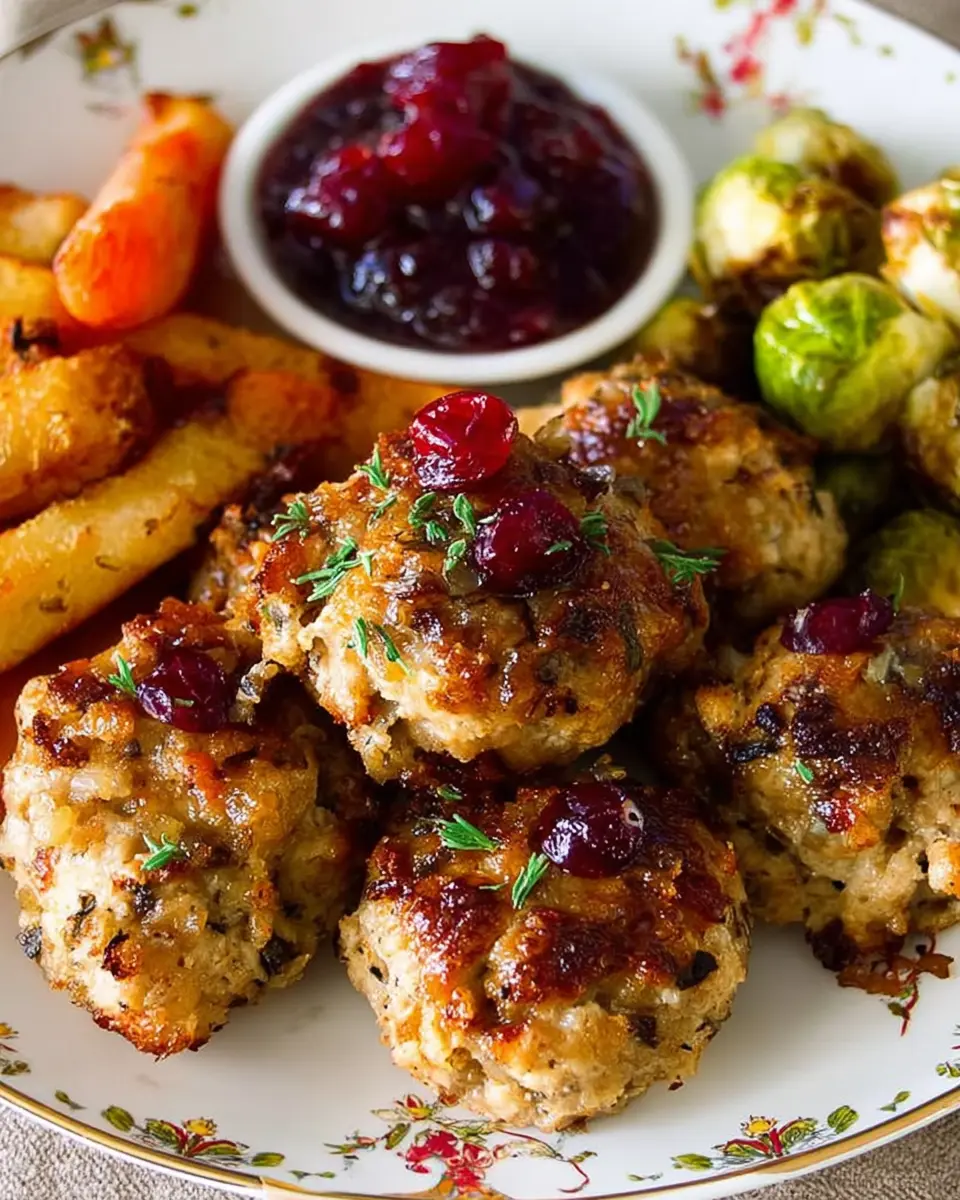 Enhance the flavors of your Turkey & Stuffing Meatballs by serving them alongside classic accompaniments. A generous drizzle of homemade cranberry sauce adds a sweet-tart touch, while a rich, savory gravy elevates the dish further. For sides, roasted baby Yukon gold potatoes and Brussels sprouts complement the meatballs beautifully, creating a well-rounded meal. Feeling adventurous? Try a dollop of apple sauce for an unexpected twist!