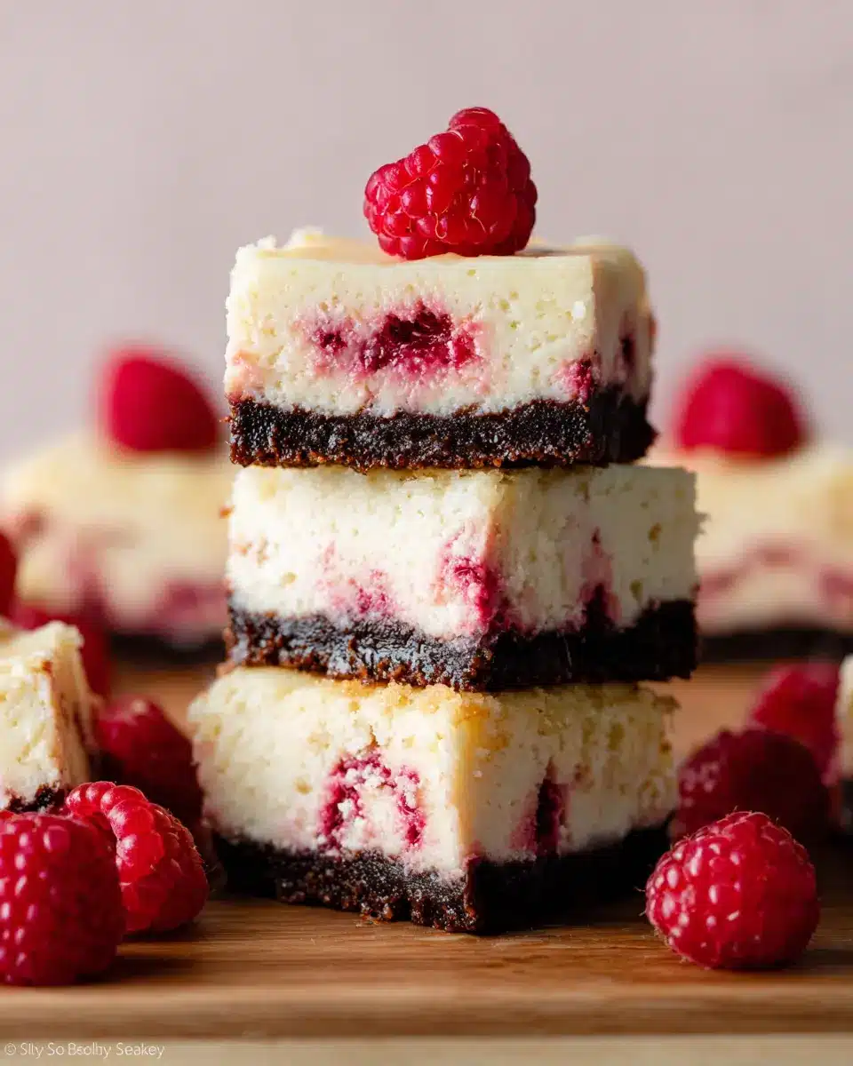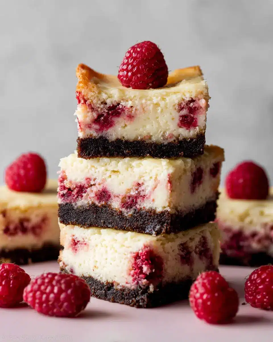 While raspberries shine in these White Chocolate Raspberry Cheesecake Bars, don’t hesitate to switch things up! You can use fresh or frozen blueberries, strawberries, or even peaches depending on the season. For a you-pick-it charm, how about combining two fruits? Think strawberries and blueberries for a holiday twist or adding a splash of lemon zest for extra zing!