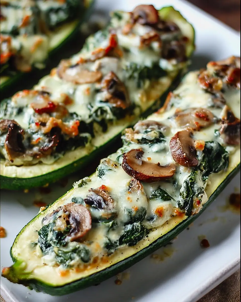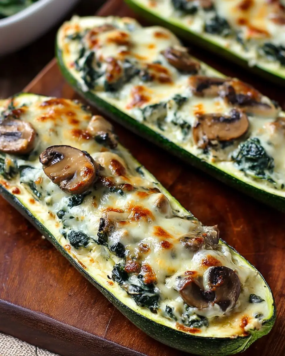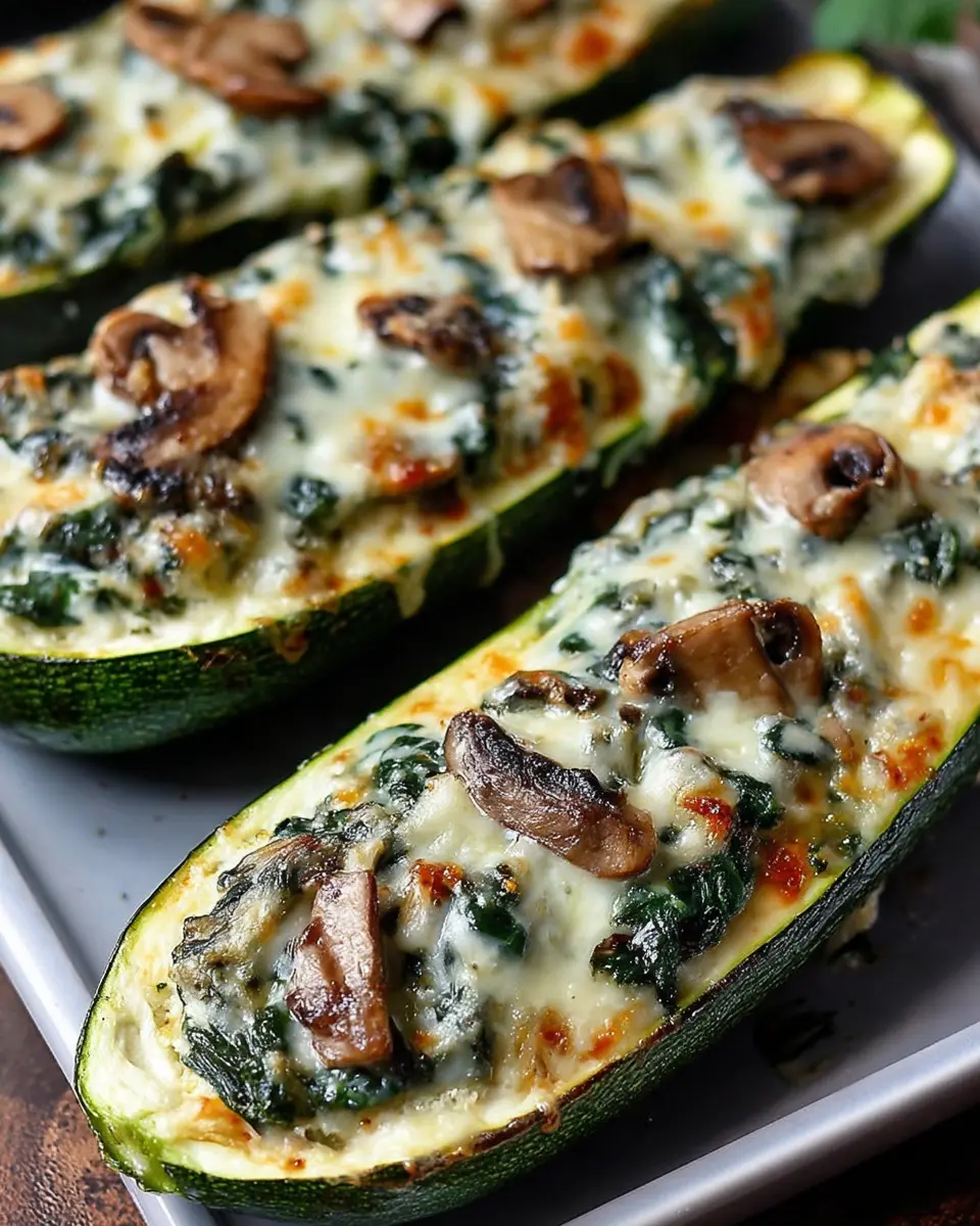To elevate your zucchini boats stuffed with spinach mushroom ricotta into a full meal, consider pairing them with a light side salad or a warm bowl of quinoa. A simple arugula salad dressed with lemon vinaigrette complements the savory flavors beautifully. You might also enjoy serving them alongside some grilled chicken or turkey bacon for added protein. Since these zucchini boats are vegetarian, incorporating a protein source ensures a balanced meal. For drinks, a refreshing cucumber mint lemonade works wonders and aligns with the fresh, vibrant tastes of the dish.